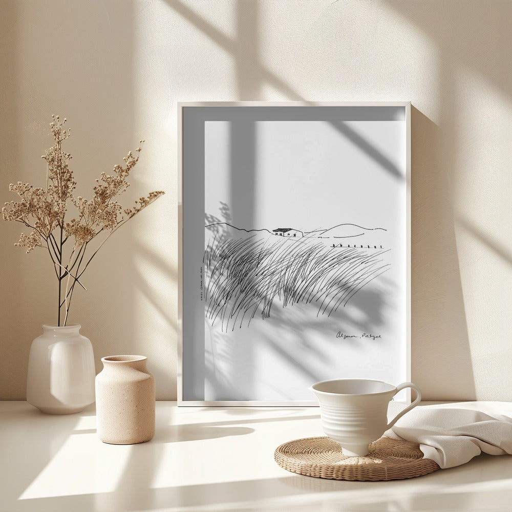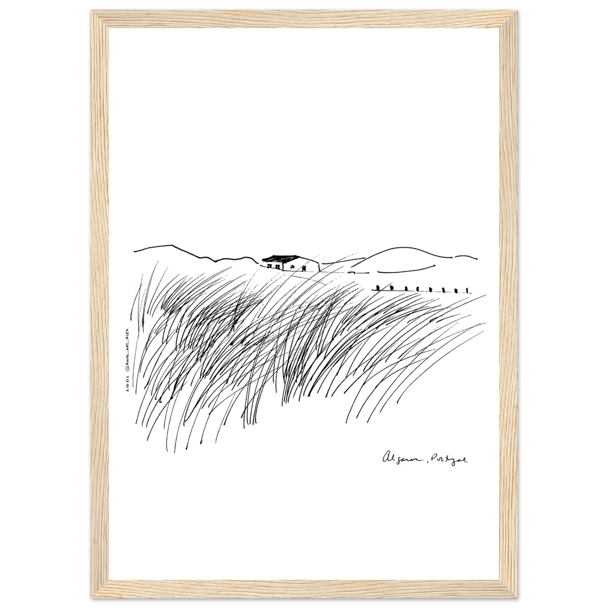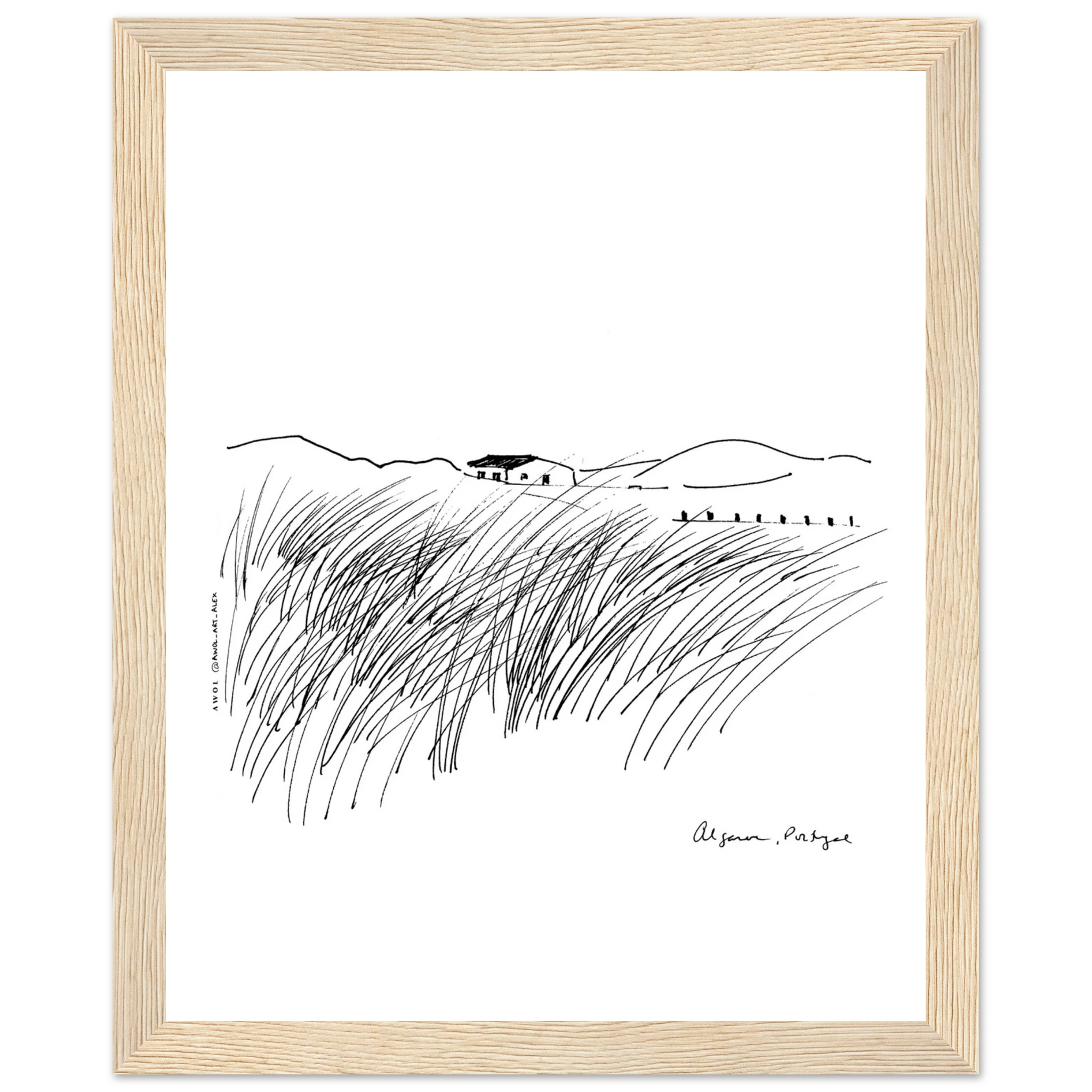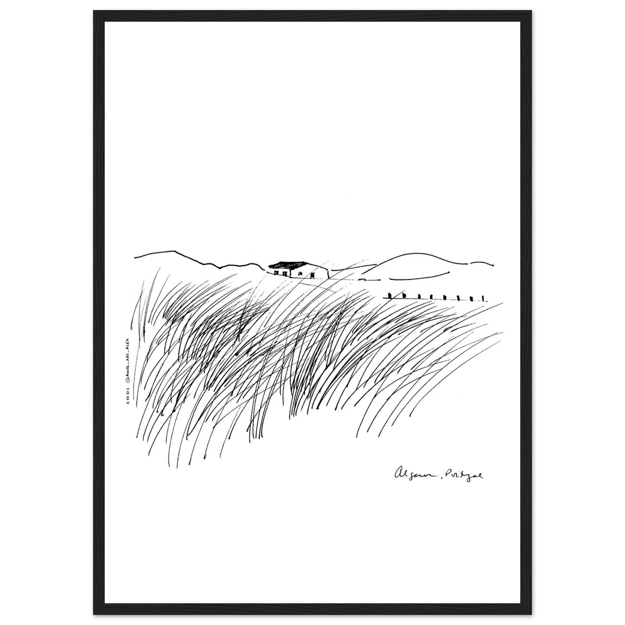This black-and-white, minimalist Portugal travel art print captures the untamed beauty of Portugal’s Algarve coast in an expressive drawing style inspired by the natural landscapes along the Atlantic ocean coastline. Showcasing this Portugese region’s raw natural charm, this modern zen monochrome artwork illustrates windswept coastal grasses bending under powerful ocean gusts, with the rhythmic motion of the tides in the distance. The sketch-like yet intricate pen-and-ink illustration brings the Algarve’s dramatic seaside landscapes to life, reflecting both its wild essence and peaceful allure. A unique artwork for Europe travellers, Portugal lovers, and for nature enthusiasts, and adventurers who find solace in the elements, this travel print seamlessly complements modern, minimalist, or bohemian interiors. Whether you’re captivated by the Algarve’s rugged coastline, the ocean’s meditative pull, or the elegance of simple line art, this piece serves as a timeless tribute to nature’s strength and serenity. A perfect addition to homes, offices, or yoga spaces, it’s an essential wall decor choice for ocean lovers and those who cherish the great outdoors.