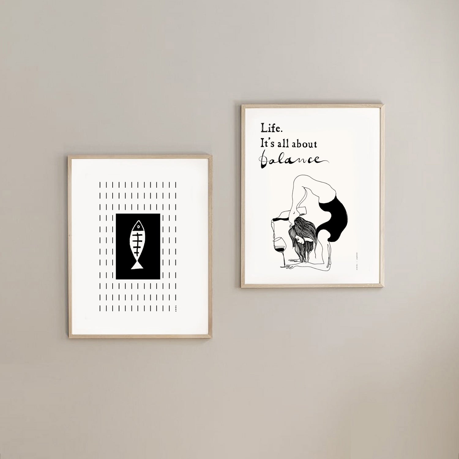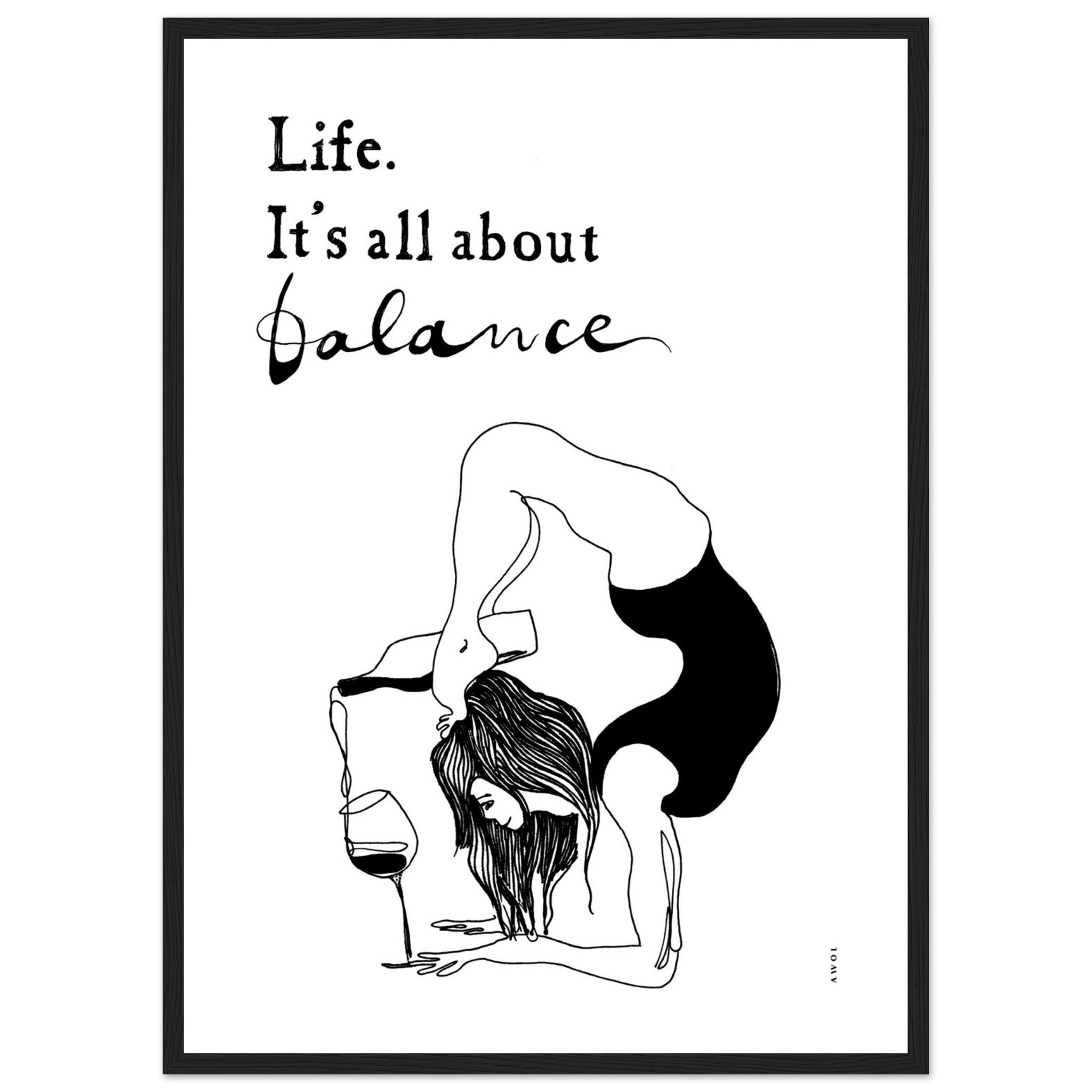 This black and white framed yoga art print blends a funny spiritual quote, a woman in a yoga pose pouring wine into a wine glass, with a fun spiritual quote “Life. It’s All About Balance”. In this modern mental health poster the art of living yoga is balanced with the love of wine, creating modern spiritual art print for your wall decor – whether you’re looking for black and white inspiring art for your yoga studio, meditation space or for your living room or bedroom, or a thoughtful and fun gift for your girlfriends who love yoga and wine. This minimalist wall art comes ready hang in a framed wall art print, making a fun, playful and contemporary monochrome yoga artwork or yoga gift, reminding you to stay zen and balanced in your yoga practice and in life.